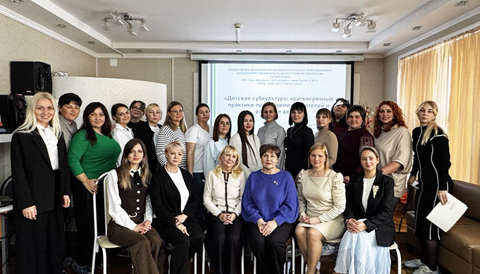 24 октября в рамках мероприятий, направленных на внедрение программы просвещения родителей (законных представителей) детей младенческого, раннего и дошкольного возрастов в дошкольных образовательных организациях Ростовской области на базе ММРЦ-МБДОУ № 177 города Ростова-на-Дону (региональная площадка, приказ министерства общего и профессионального образования Ростовской области от 19.11.2024 № 1076) преподавателем кафедры дошкольного и начального образования ГАУ ДПО РО ИРО Баландиной Л.А., методистом МАУ ИМЦО г. Ростова-на-Дону Клевцовой И.С., была проведена очная стажировка для руководящих и педагогических работников дошкольных образовательных учреждений Ростовской области и города Ростова-на-Дону «Детская субкультура: краткосрочные практики просвещения родителей и развития детей».